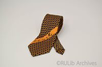 เนคไทสีทองบรอนช์ลายตาชะลอมสีน้ำเงินแก่ตลอดผืนและปลายแหลมแบบสามเหลี่ยม เครื่องแบบนักศึกษาของมหาวิทยาลัยรามคำแหง