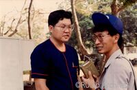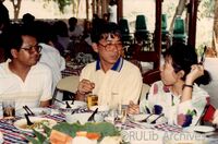 ดร. เอื้อน ปิ่นเงิน และ รองศาสตราจารย์สมคิด ธีรศิลป์ ร่วมรับประทานอาหารกลางวัน หลังจากชมโบราณสถานต่างๆ ในอุทยานประวัติศาสตร์ ตำแหน่งจากซ้ายไปขวาของภาพ (1) ดร. เอื้อน ปิ่นเงิน ผู้อำนวยการสถาบันบริการคอมพิวเตอร์ และ (2) รองศาสตราจารย์สมคิด ธีรศิลป์ ผู้อำนวยการสำนักเทคโนโลยีการศึกษา ร่วมรับประทานอาหารกลางวัน หลังจากชมโบราณสถานต่างๆ ในอุทยานประวัติศาสตร์ กับเจ้าหน้าที่ทางจังหวัด และศิษย์เก่ามหาวิทยาลัยรามคำแหง และเดินทางไปยัง อำเภอศรีสัชชนาลัย เพื่อชมโบราณสถานบริเวณศูนย์ประวัติศาสตร์ศรีสัชชนาลัย ในการสัมมนาการเตรียมการจัดตั้งศูนย์วัฒนธรรมและการวิจัยว่าด้วยยุคสุโขทัย เมื่อวันที่ 19 มีนาคม 2531 ณ อุทยานประวัติศาสตร์สุโขทัย จังหวัดสุโขทัย -