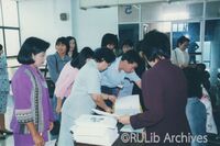 ผู้ฝึกอบรมขณะลงทะเบียนฝึกอบรม เรื่อง “การประกันคุณภาพในห้องสมุดสถาบันอุดมศึกษา” เมื่อวันที่ 27 กุมภาพันธ์ 2544 ณ ห้องประชุม ชั้น 5 อาคาร 3 สำนักหอสมุดกลาง มหาวิทยาลัยรามคำแหง -
