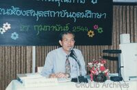 บรรยากาศอาจารย์อภัย ประกอบผล ขณะบรรยายแก่ผู้ฝึกอบรม ในการฝึกอบรม เรื่อง “การประกันคุณภาพในห้องสมุดสถาบันอุดมศึกษา” เมื่อวันที่ 27 กุมภาพันธ์ 2544 ณ ห้องประชุม ชั้น 5 อาคาร 3 สำนักหอสมุดกลาง มหาวิทยาลัยรามคำแหง -