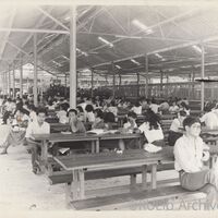 นักศึกษาขณะนั่งพักตามอัธยาศัยในโรงอาหาร ซึงตั้งอยู่ด้านข้างอาคารเบกพล เยื้องกับอาคาร สวป. ปัจจุบันได้ถูกรื้อถอนแล้ว และใช้พื้นที่สร้างเป็นอาคารจอดรถ จากด้านหลังของภาพปรากฏอาคารเรียนชั้นเดียวเดียว คือ อาคาร NB1 (ไม่ปรากฏปีที่ถ่ายภาพ)