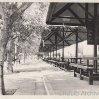 ซุ้มนักศึกษา บริเวณด้านหลังตึก A.D.1 และด้านซ้ายของภาพ คือ เรือนเพาะชำกล้าไม้ของมหาวิทยาลัยรามคำแหง (ไม่ปรากฏปีที่ถ่ายภาพ)