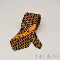เนคไทสีทองบรอนช์ลายตาชะลอมสีน้ำเงินแก่ตลอดผืนและปลายแหลมแบบสามเหลี่ยม เครื่องแบบนักศึกษาของมหาวิทยาลัยรามคำแหง