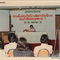 คุณสุธนา (สุทธิดาวัลย์) วงศ์ทองสรรค์ ขณะกล่าวเปิดการอบรมทางวิชาการ “การเพิ่มประสิทธิภาพในการให้บริการของสำนักหอสมุดกลาง" ระหว่างวันที่ 24-25 กันยายน 2530 ณ ห้องประชุม ชั้น 5 อาคาร 3 สำนักหอสมุดกลาง