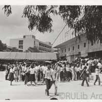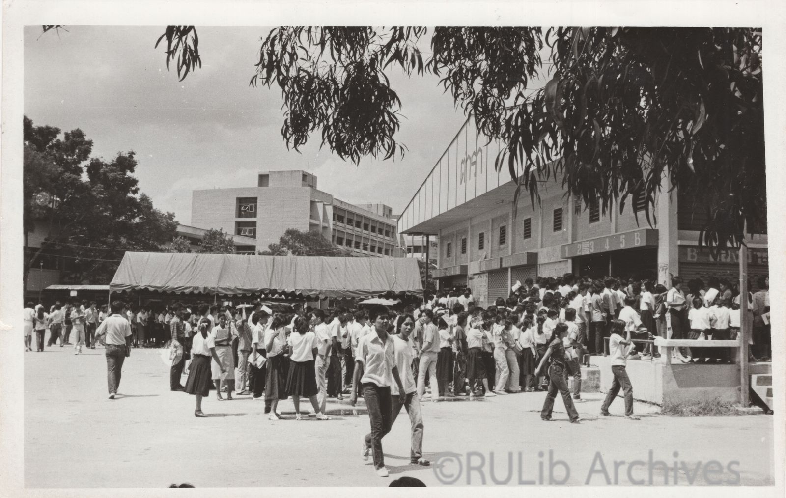 บรรยากาศการซื้อตำราเรียนของนักศึกษา ณ อาคาร NB14 ที่ใช้เป็นสถานที่จำหน่ายตำรา เยื้องกับโรงยิม 2 (GB2) และอาคารสูง 5 ชั้น ถัดจากโรงยิม 2 ที่ปรากฏในภาพ คือ อาคารของคณะเศรษฐศาสตร์