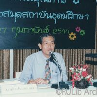 อาจารย์อภัย ประกอบผล ขณะบรรยายแก่ผู้ฝึกอบรมในการฝึกอบรม เรื่อง “การประกันคุณภาพในห้องสมุดสถาบันอุดมศึกษา” เมื่อวันที่ 27 กุมภาพันธ์ 2544 ณ ห้องประชุม ชั้น 5 อาคาร 3 สำนักหอสมุดกลาง มหาวิทยาลัยรามคำแหง