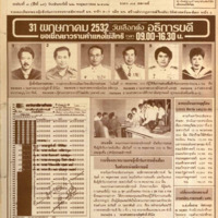 หน้า 1 - ข่าวรายนามผู้ได้รับการเสนอชื่อเป็นอธิการบดี (มีภาพ รศ. ชูศักดิ์ ศิรินิล, รศ. สพโชค ลชิตากุล, รศ. รังสรรค์ แสงสุข, ศ. ดร. ธรรมนูญ โสภารัตน์, ผศ. วิวัฒน์ชัย กุลมาตย์ และ รศ. ศิวาพร มัณฑุกานนท์), ข่าวบัตรหยั่งเสียงเพื่อสรรหาคณบดีสำหรับนักศึกษา (มีภาพประกอบจำนวน 1 ภาพ), ข่าวคณะกรรมการสรรหาอธิการบดีเปิดรับการเสนอชื่อ (มีภาพประกอบจำนวน 1 ภาพ), รายชื่อและหมายเลขผู้เข้ารับการหยั่งเสียงในตำแหน่งอธิการบดี, ลงทะเบียนภาคฤดูร้อน 2/2531 จำนวน 146,125 คน, เปลี่ยนแปลงสถานที่การสมัคร/รายงานตัว นศท.