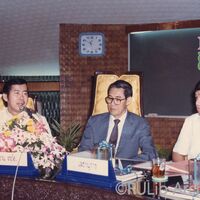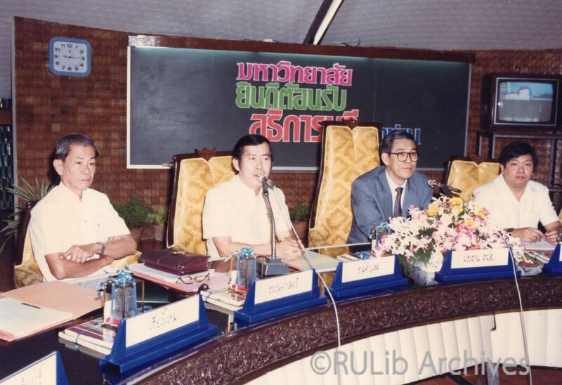 การประชุมอธิการบดีทั่วประเทศ ณ ห้องประชุมใต้พระรูปพ่อขุนรามคำแหง เมื่อวันที่ 28 พฤษภาคม 2531 โดยมีอธิการบดีและผู้แทนจากสถาบันอุดมศึกษา 16 แห่งเข้าร่วมประชุม และมี ศาสตราจารย์นายแพทย์อาวุธ ศรีศุกรี อธิการบดีมหาวิทยาลัยเชียงใหม่ (คนที่สามจากซ้าย) เป็นประธานที่ประชุม, คนที่สองจากซ้าย ศาสตราจารย์ดร.ธรรมนูญ โสภารัตน์ อธิการบดีมหาวิทยาลัยรามคำแหง