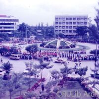 ขบวนพาเหรดจากคณะ สำนักต่างๆ ในการร่วมการแข่งขันกีฬาบุคลากรภายใน มหาวิทยาลัยรามคำแหง ประจำปี 2529 บริเวณรอบลานพระบรมราชานุสาวรีย์พ่อขุนรามคำแหงมหาราช ในพิธีเปิดการแข่งขัน วันที่ 25 กรกฎาคม 2529