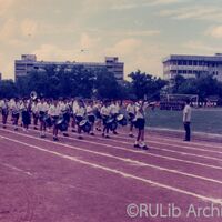 วงโยธวาทิตโรงเรียนสาธิตมหาวิทยาลัยรามคำแหง ขณะนำขบวนพาเหรดเข้าสู่สนามกีฬา ในพิธีเปิดการแข่งขันกีฬาบุคลากร มหาวิทยาลัยรามคำแหง ประจำปี 2529 เมื่อวันที่ 25 กรกฎาคม 2529 ณ สนามกีฬา มหาวิทยาลัยรามคำแหง