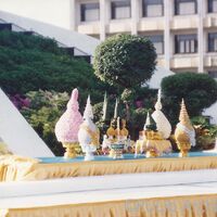 เครื่องราชสักการะพระบรมราชานุสาวรีย์ พ่อขุนรามคำแหงมหาราช ประกอบด้วย ธูปเทียนแพและกระทงดอกไม้ พุ่มเงิน พุ่มทอง พุ่มดอกไม้ ในพิธีเปิดงานวันสถาปนามหาวิทยาลัยรามคำแหง ครบรอบ 20 ปี "20 ปี รามคำแหง" เมื่อวันที่ 26 พฤศจิกายน 2534 ณ บริเวณลานพระบรมราชานุสาวรีย์ พ่อขุนรามคำแหงมหาราช