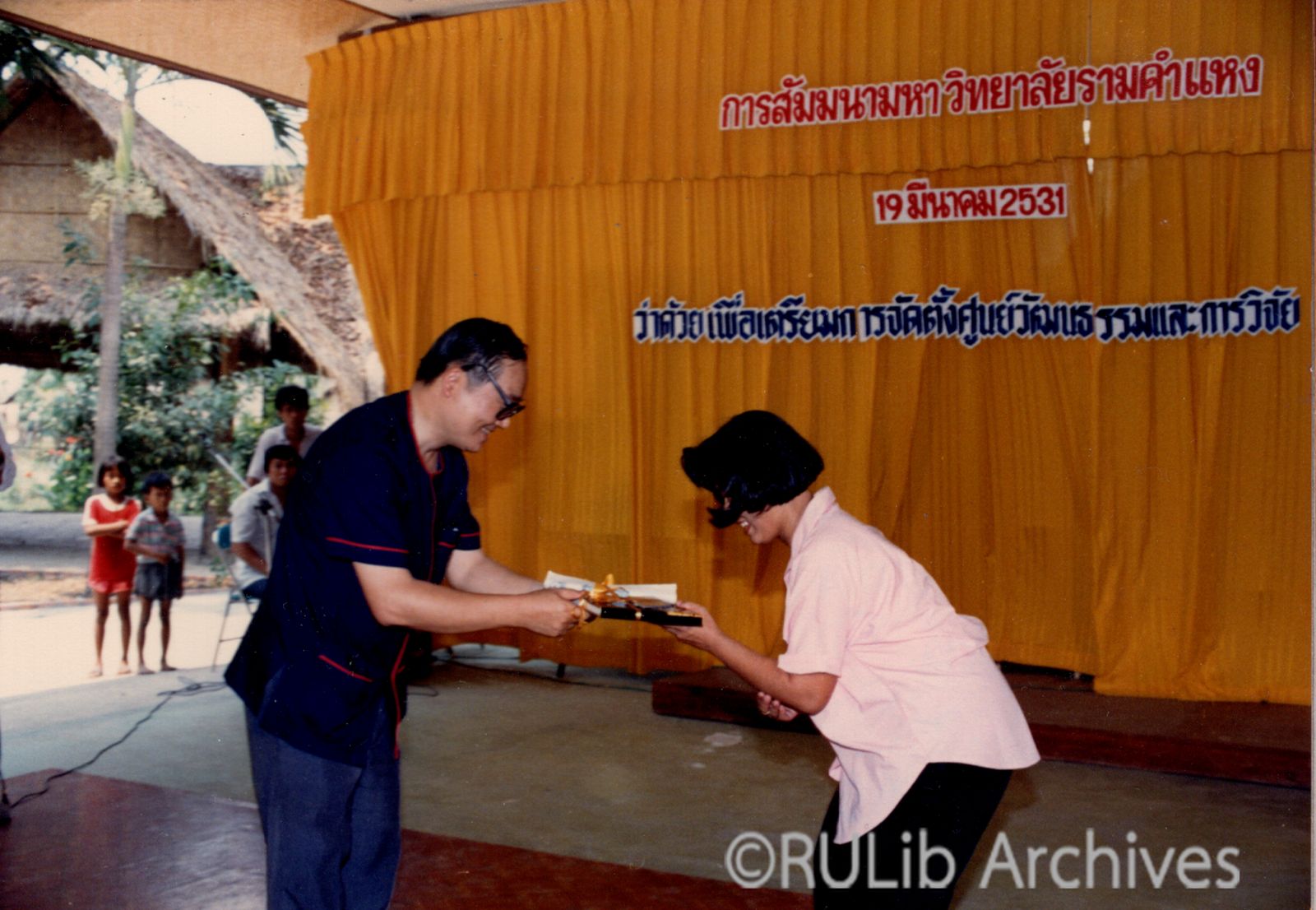 รองศาสตราจารย์ ดร. บรรพต วีระสัย รองอธิการบดีฝ่ายวิชาการ มอบของที่ระลึกให้กับผู้ที่มีส่วนเกี่ยวข้อง ในการสัมมนาจัดตั้งศูนย์วัฒนธรรมและการวิจัยว่าด้วยยุคสุโขทัย เมื่อวันที่ 19 มีนาคม 2531 ณ อุทยานประวัติศาสตร์สุโขทัย จังหวัดสุโขทัย