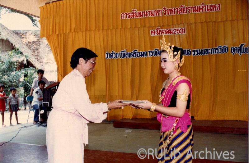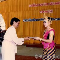 ผู้แทนคณาจารย์ และผู้เข้าร่วมสัมมนา มอบของที่ระลึกให้กับนักแสดง ระบำสุโขทัย ในการสัมมนาจัดตั้งศูนย์วัฒนธรรมและการวิจัยว่าด้วยยุคสุโขทัย เมื่อวันที่ 19 มีนาคม 2531 ณ อุทยานประวัติศาสตร์สุโขทัย จังหวัดสุโขทัย