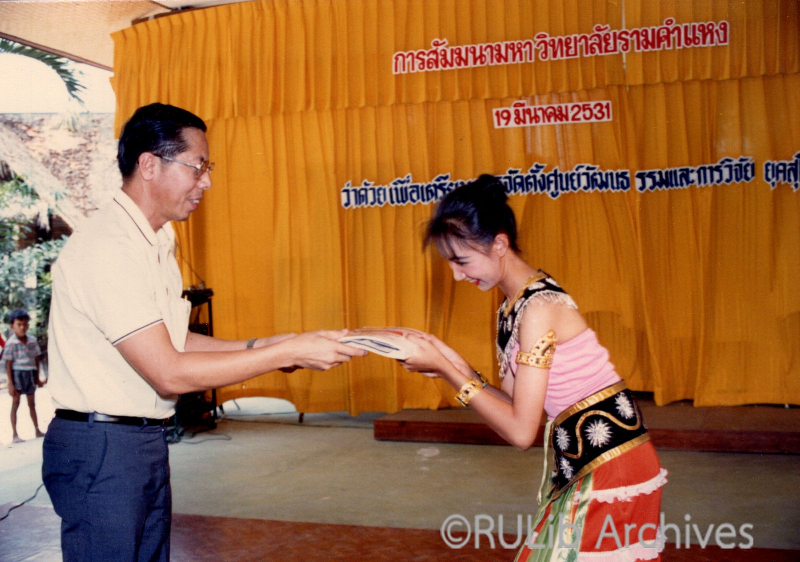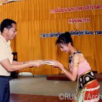 อาจารย์ อภิสิทธิ์ มฤคพิทักษ์ ผู้อำนวยการกองกิจการนักศึกษา มอบของที่ระลึกให้กับนักแสดง ระบำสุโขทัย ในการสัมมนาจัดตั้งศูนย์วัฒนธรรมและการวิจัยว่าด้วยยุคสุโขทัย เมื่อวันที่ 19 มีนาคม 2531 ณ อุทยานประวัติศาสตร์สุโขทัย จังหวัดสุโขทัย