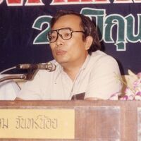 นายเกษม จันทร์น้อย ผู้อภิปรายเรื่อง ความรับผิดชอบของสื่อมวลชนต่อสังคม ในการสัมมนา "รามคำแหงพบสื่อมวลชน"
