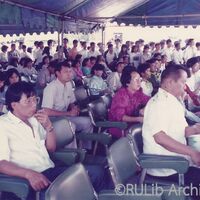 ผู้ร่วมงานในวันนัดพบแรงงาน ครั้งที่ 9 ขณะนั่งในเต็นท์ ในพิธีเปิดงานวันนัดพบแรงงาน ครั้งที่ 9 เมื่อวันที่ 27 มีนาคม 2532 ณ ลานพระบรมรูปขุนรามคำแหงมหาราช