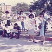 ผู้ร่วมงานขณะอ่านประการับสมัครงานในวันนัดพบแรงงาน ครั้งที่ 9 เมื่อวันที่ 27 มีนาคม 2532 ณ บริเวณรอบสระน้ำ มหาวิทยาลัยรามคำแหง