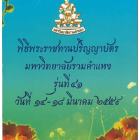 สำเนาพระราโชวาท สมเด็จพระเทพรัตนราชสุดาฯ สยามบรมราชกุมารี ในพิธีพระราชทานปริญญาบัตรแก่ผู้สำเร็จการศึกษาจากมหาวิทยาลัยรามคำแหง ประจำปีการศึกษา 2556-2557 ณ อาคารหอประชุมพ่อขุนรามคำแหงมหาราช มหาวิทยาลัยรามคำแหง วันที่ 2 มีนาคม 2558 -- กรรมการสภามหาวิทยาลัยรามคำแหง -- คณะผู้บริหารมหาวิทยาลัยรามคำแหง --กำหนดการ -- คำกราบบังคมทูล ของ นายวิรัช ชินวินิจกุล นายกสภามหาวิทยาลัยรามคำแหง กราบบังคมทูลสำนึกในพระมหากรุณาธิคุณและเบิกอธิการบดีมหาวิทยาลัยรามคำแหง ในพิธีพระราชทานปริญญาบัตรแก่ผู้สำเร็จการศึกษา ประจำปี 2557-2558 ณ อาคารหอประชุมพ่อขุนรามคำแหงมหาราช มหาวิทยาลัยรามคำแหง วันที่ 14 มีนาคม 2559 -- คำกราบบังคมทูล ของ รองศาสตราจารย์ปรีชา พหลเทพ คณบดีคณะวิทยาศาสตร์ รักษาการแทนอธิการบดีมหาวิทยาลัยรามคำแหง กราบบังคมทูลรายงานกิจการมหาวิทยาลัยรามคำแหง ในพิธีพระราชทานปริญญาบัตรแก่ผู้สำเร็จการศึกษา ประจำปีการศึกษา 2557-2558 ณ อาคารหอประชุมพ่อขุนรามคำแหงมหาราช มหาวิทยาลัยรามคำแหง วันที่ 14 มีนาคม 2559 -- คำกราบบังคมทูล ของ นายวิรัช ชินนิจกุล นายกสภามหาวิทยาลัยรามคำแหง สดุดีเกียรติคุณผู้ได้รับพระราชทานปริญญาบัตรดุษฎีบัณฑิตกิตติมศักดิ์ ในพิธีพระราชทานปริญญาบัตรแก่ผู้สำเร็จการศึกษา ประจำปีการศึกษา 2557-2558 ณ อาคารหอประชุมพ่อขุนรามคำแหงมหาราช มหาวิทยาลัยรามคำแหง วันที่ 14, 17 มีนาคม 2559 -- รายนามผู้รับพระราชทานปริญญากิตติมศักดิ์ ประจำปีการศึกษา 2557-2558 -- ข้อมูลบัณฑิตรุ่นที่ 41 ปีการศึกษา 2557 -- นายกสภามหาวิทยาลัยรามคำแหง --อธิการบดีมหาวิทยาลัยรามคำแหง -- คณะกรรมการสภามหาวิทยาลัยรามคำแหง -- รายนามคณบดีและผู้อำนวยการสำนัก/สถาบัน -- รายพระนามและรายนามบัณฑิตกิตติมศักดิ์ของมหาวิทยาลัยรามคำแหง -- การเสด็จพระราชดำเนินทรงประกอบพิธี "เปิดพระบรมรูปและพระบรมราชานุสาวรีย์พ่อขุนรามคำแหงมหาราช โดย ทวีศักดิ์ เกษปทุม -- คณะอนุกรรมการฝ่ายจัดทำหนังสือที่ระลึก สูจิบัตร และบัตรเชิญ