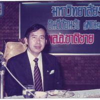 ศาสตราจารย์ ดร.ธรรมนูญ โสภารัตน์ อธิการบดีมหาวิทยาลัยรามคำแหง ขณะนั่งในงานเลี้ยงรับรองพิธีเปิดงานวันนัดพบแรงงาน ครั้งที่ 9 เมื่อวันที่ 27 มีนาคม 2532 ณ ห้องประชุมใต้พระบรมรูปพ่อขุนรามคำแหงมหาราช