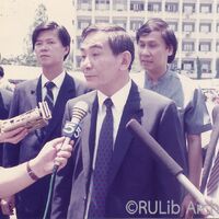 นายวัฒนา อัศวเหม รัฐมนตรีช่วยว่าการกระทรวงมหาดไทย ในฐานะประธานคณะกรรมการอำนวยการจัดงานวันนัดพบแรงงาน ครั้งที่ 9 ขณะให้สัมภาษณ์นักข่าวททบ.5 และสื่ออื่นๆ ณ บริเวณลานพระบรมรูปพ่อขุนรามคำแหงมหาราช มหาวิทยาลัยรามคำแหง ในวันที่ 27 มีนาคม 2532 ณ ลานพระบรมรูปพ่อขุนรามคำแหง