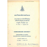 ประกาศกระบวนวิชาที่เปิดสอน พร้อมกับวันและเวลาสอบไล่ ภาคฤดูร้อน ปีการศึกษา 2515 20 เมษายน – 4 มิถุนายน 2516