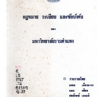 กฎหมาย พระราชบัญญัติมหาวิทยาลัยรามคำแหง พ.ศ. 2514 -- ประกาศคณะปฏิวัติ ฉบับที่ 185 -- ข้อบังคับมหาวิทยาลัยรามคำแหงว่าด้วย ปีการศึกษาและภาคเรียน พ.ศ. 2516 -- ข้อบังคับมหาวิทยาลัยรามคำแหงว่าด้วย การศึกษาชั้นปริญญาตรี พ.ศ. 2514 -- ข้อบังคับมหาวิทยาลัยรามคำแหงว่าด้วย การศึกษาชั้นปริญญาตรี (ฉบับที่ 2) พ.ศ. 2516 -- ข้อบังคับมหาวิทยาลัยรามคำแหงว่าด้วย การศึกษาชั้นปริญญาตรี (ฉบับที่ 3) พ.ศ. 2517 -- ข้อบังคับมหาวิทยาลัยรามคำแหงว่าด้วย อัตราค่าธรรมเนียมการศึกษา ค่าลงทะเบียนและค่าบำรุง พ.ศ. 2516 -- ข้อบังคับมหาวิทยาลัยรามคำแหง ว่าด้วยอัตราค่าธรรมเนียมการศึกษา ค่าลงทะเบียนและค่าบำรุง (ฉบับที่ 2) พ.ศ. 2517 -- ข้อบังคับมหาวิทยาลัยรามคำแหงว่าด้วย เครื่องแบบ เครื่องหมาย และเครื่องแต่งกายนักศึกษา พ.ศ. 2514 -- ข้อบังคับมหาวิทยาลัยรามคำแหง ว่าด้วยคุณสมบัติของผู้สมัครเข้าเป็นนักศึกษาคณะศึกษาศาสตร์ พ.ศ. 2514 -- ข้อบังคับมหาวิทยาลัยรามคำแหงว่าด้วย โรงเรียนสาธิตมหาวิทยาลัยรามคำแหง พ.ศ. 2514 -- ข้อบังคับมหาวิทยาลัยรามคำแหงว่าด้วย โรงเรียนสาธิตมหาวิทยาลัยรามคำแหง (ฉบับที่ 2) พ.ศ. 2515 -- ข้อบังคับมหาวิทยาลัยรามคำแหงว่าด้วยโรงเรียนสาธิตมหาวิทยาลัยรามคำแหง (ฉบับที่ 3) พ.ศ. 2517 -- ข้อบังคับมหาวิทยาลัยรามคำแหงว่าด้วย โรงเรียนสาธิตมหาวิทยาลัยรามคำแหง (ฉบับที่ 4) พ.ศ. 2517 -- ข้อบังคับมหาวิทยาลัยรามคำแหงว่าด้วย วินัยนักศึกษา พ.ศ. 2514 -- ข้อบังคับมหาวิทยาลัยรามคำแหงว่าด้วย วินัยนักศึกษา (ฉบับที่ 2) พ.ศ. 2515 – ข้อบังคับมหาวิทยาลัยรามคำแหงว่าด้วย วินัยนักศึกษา (ฉบับที่ 3) พ.ศ. 2516 -- ข้อบังคับมหาวิทยาลัยรามคำแหงว่าด้วย การปกครองนักศึกษามหาวิทยาลัยรามคำแหง พ.ศ. 2517 -- ข้อบังคับว่าด้วย การเลือกตั้ง พ.ศ. 2517 -- ข้อบังคับว่าด้วยพรรค พ.ศ. 2517 -- ข้อบังคับมหาวิทยาลัยรามคำแหงว่าด้วย โรงพิมพ์มหาวิทยาลัยรามคำแหง พ.ศ. 2516 -- ข้อบังคับมหาวิทยาลัยรามคำแหงว่าด้วย สาขาวิชาที่มีการสอนในมหาวิทยาลัยรามคำแหง พ.ศ. 2517 -- ระเบียบมหาวิทยาลัยรามคำแหงว่าด้วย การศึกษาภาคฤดูร้อน โรงเรียนสาธิต มหาวิทยาลัยรามคำแหง พ.ศ. 2517 -- ระเบียบมหาวิทยาลัยรามคำแหงว่าด้วย การสอนภาคฤดูร้อน พ.ศ. 2515 -- ระเบียบมหาวิทยาลัยรามคำแหงว่าด้วย เครื่องหมายและเสื้อสามารถนักกีฬามหาวิทยาลัยรามคำแหง พ.ศ. 2516 -- ระเบียบมหาวิทยาลัยรามคำแหงว่าด้วย การใช้ห้องสมุด พ.ศ. 2514