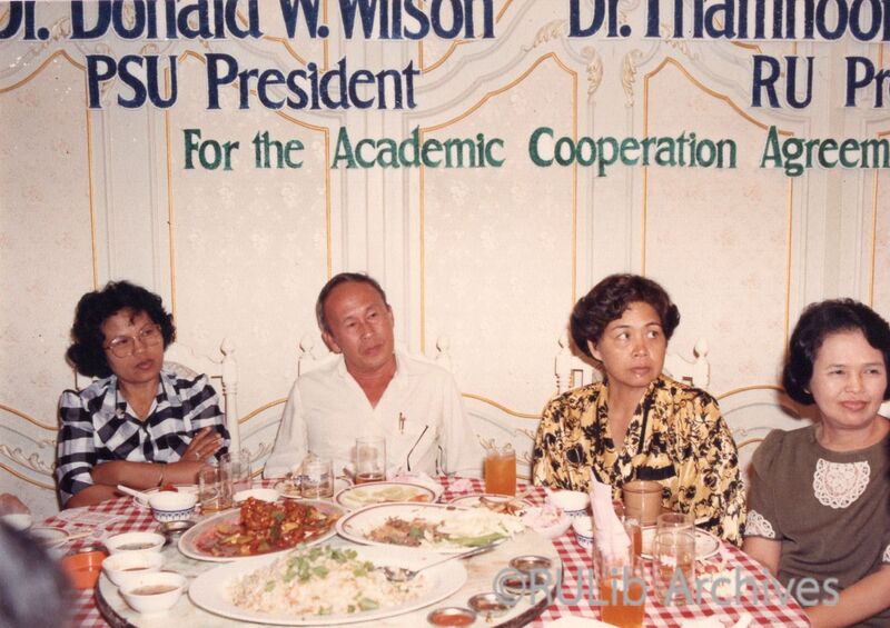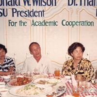 บุคคลในภาพ (เรียงจากซ้าย) 1) รองศาสตราจารย์ ดร.รุจิร์ ภู่สาระ และ 2) ผู้ช่วยศาสตราจารย์วิเชษฐ เทพเฉลิม ขณะนั่งที่โต๊ะอาหารในงานเลี้ยงแสดงความยินดี การลงนามข้อตกลงความร่วมมือทางวิชาการและเทคนิค ระหว่างมหาวิทยาลัยรามคำแหง กับ Pittsburg State University เมื่อวันที่ 26 ตุลาคม 2531