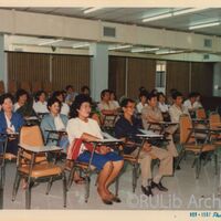 ผู้เข้าร่วมการอบรบ ขณะนั่งฟังการอบรม เรื่อง "การบำรุงรักษาทรัพยากรห้องสมุดและการให้บริการของนักการภารโรง" สำนักหอสมุดกลาง ระหว่างวันที่ 28-29 กันยายน 2530 ณ ห้องประชุม ชั้น 5 อาคาร 3 สำนักหอสมุดกลาง มหาวิทยาลัยรามคำแหง