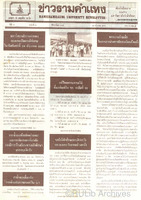 หน้า 1 - ข่าวบัณฑิต ม.ร.รุ่น 3 ทูลเกล้าถวายเงิน ภาพและข่าวโดย ลีนา วิวัฒน์วรพันธ์ (มีภาพประกอบจำนวน 1 ภาพ), ข่าวนิทรรศการ "มงคลชีวิต" ภาพและข่าวโดย ศิริมาฆ สุทธิจิตร (มีภาพประกอบจำนวน 1ภาพ), ข่าวพิธีเปิดป้าย อ.ศ.ม.ร. ภาพและข่าวโดย ศิริมาฆ สุทธิจิตร (มีภาพประกอบจำนวน 1ภาพ), ข่าวงบประมาณการก่อสร้างวิทยาเขตของ ม.ร.โดยคณะกรรมการประชาสัมพันธ์ (ภาพรศ.พินิจ รื่นเริง), ข่าวประกาศจากฝ่ายตำรา โดย ฝ่ายตำรา, ข่าวปาฐกถาธรรม ภาพและข่าวโดย ยุคนธร รัตรสาร (ภาพพระราชนันทมุนี (ท่านปัญญานันทภิกขุ)), ข่าวนิทรรศการ "เบิกฟ้า วัฒนธรรม บำเพ็ญ 23" ภาพและข่าวโดย ยุคนธร รัตรสาร (มีภาพประกอบจำนวน 1ภาพ), คอลัมน์ข่าวล่า โดย กองบรรณาธิการ