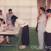 นักศึกษาขณะรับคู่มือปฐมนิเทศนักศึกษาใหม่ ณ อาคารหอประชุมพ่อขุนรามคำแหงมหาราช (ไม่ปรากฏปีที่ถ่ายภาพ)