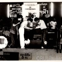 บรรยากาศการรับมอบสิ่งของ ในกิจกรรมหาทุนสร้างค่ายของชมรมค่ายอาสาพัฒนามหาวิทยาลัยรามคำแหง เมื่อวันที่ 4 ตุลาคม 2524 ณ เวทีราชดำเนิน ถนนราชดำเนินนอก แขวงวัดโสมนัส เขตป้อมปราบศัตรูพ่าย จังหวัดกรุงเทพมหานคร