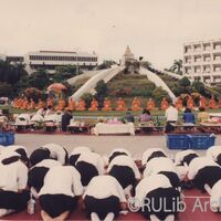 นักศึกษา มหาวิทยาลัยรามคำแหง ขณะเข้าร่วมในทำบุญตักบาตร บริเวณลานพระบรมรูปพ่อขุนรามคำแหงมหาราช
