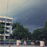 นักศึกษาเตะตะกร้อบริเวณลานพระบรมรูปพ่อขุนรามคำแหงมหาราช (ไม่ปรากฏปีที่ถ่ายภาพ)